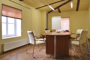 В переговорной необходимо было создать уютную рабочую атмосферу. Благодаря тому, что оконные проёмы очень глубокие и окна могут откидываться для проветривания даже при закрытых жалюзи плиссе, было решено закрепить плиссе на проём окна, т.е. к стене. На фото была использована система Р1200, управление с помощью цепочки. Это наиболее практичный и надёжный способ управления для частого использования жалюзи плиссе.